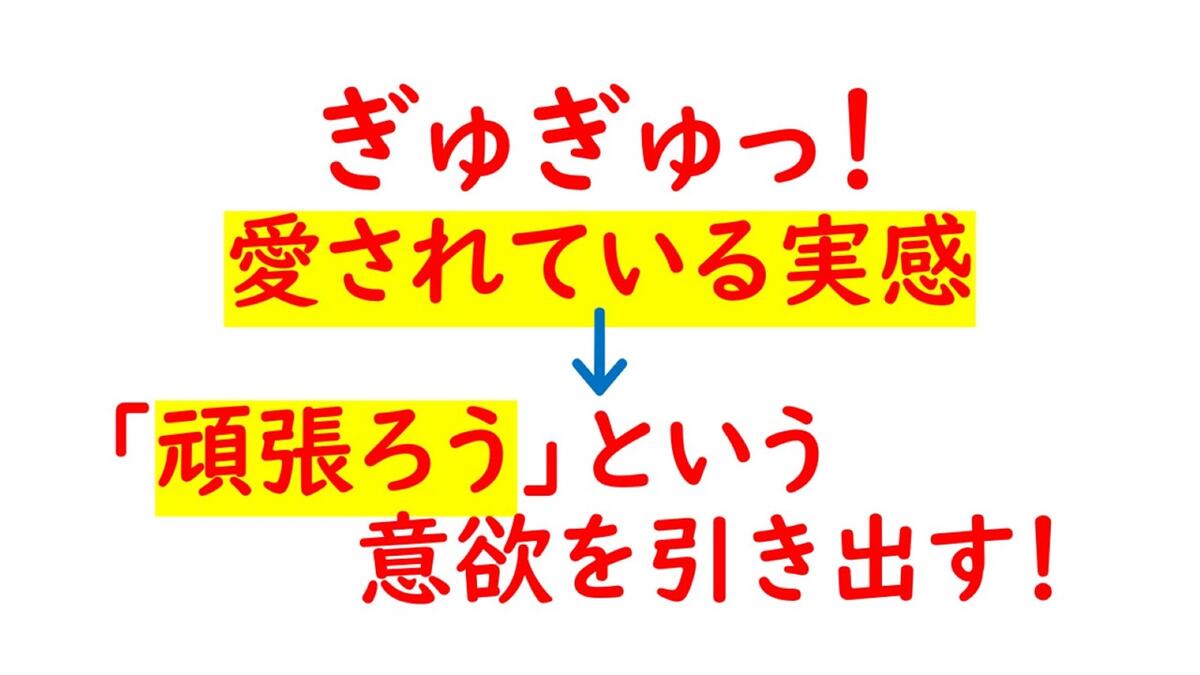 一つは、「愛されているという実感」です。子供は、我々もそうです、「愛されている」と思えるから頑張れる。