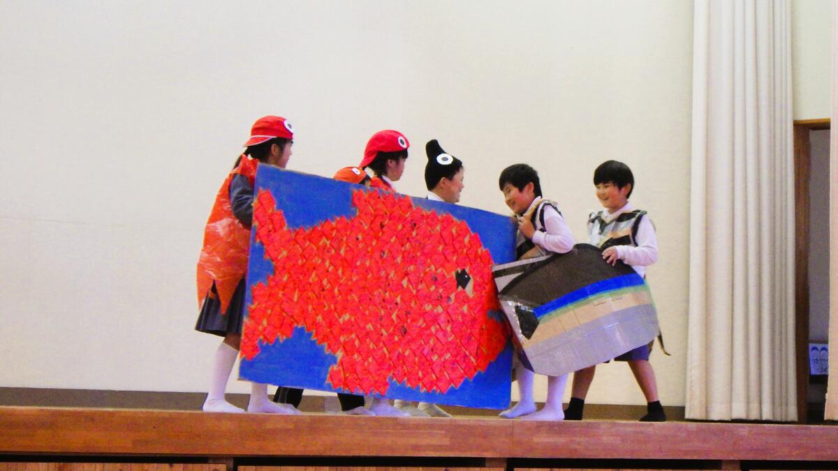 2年生の発表は「スイミー」。朗読、セリフ、踊り、歌など全てをカンペキに暗記して、堂々と楽しく発表することができました。スイミーと仲間たち、こわ~いマグロ、踊りの上手なクラゲさんとカニさんなど衣装も手作りで、会場を大いに沸かしてくれました。懐かしの「横浜銀蝿」「猪木のテーマ」「ドリフ全員集合」など劇中の効果音にも、斉藤先生&子ども達 のこだわりと、「せっかくだから、みんなで楽しんじゃおう!」という気概を感じました。