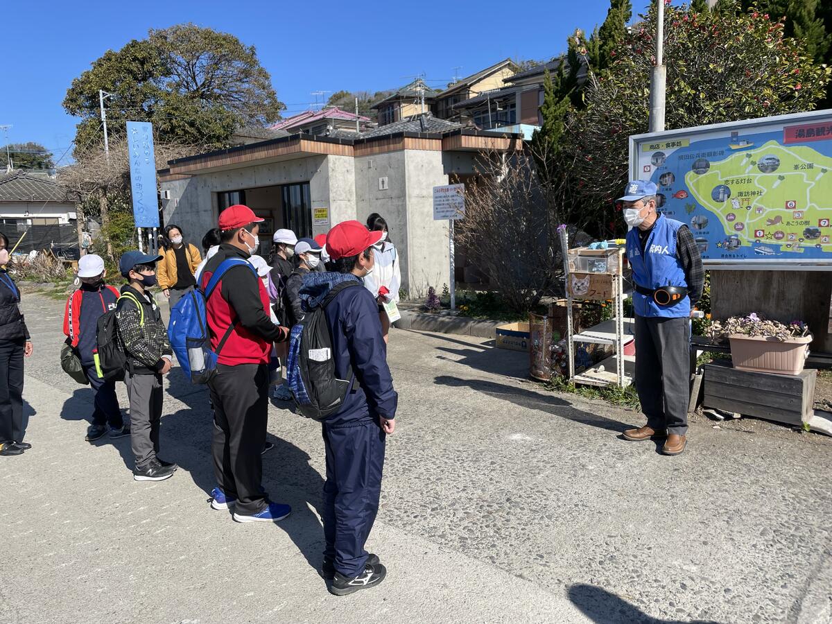 3月14日(火)、天草四郎観光協会の杉本さん、池田さん(陽向さんママ)の企画による「小中学生を対象とした観光ガイド体験」に参加させていただき、5年生全員で湯島に行ってきました。