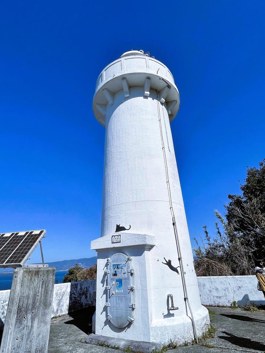「ガイド猫」と一緒に細い坂道を登り切ると、そこには湯島灯台。大正時代に建てられた当時のレトロな姿を保ったまま、島原湾、湯島瀬戸を往来する船を見守る姿は深い歴史を感じさせます。灯台に向かう小道にも、真っ白な灯台の側面にも、かわいい猫の足跡が‥。ここで結婚式を挙げたカップルもおり、蒼空と碧海に挟まれた、まさに絶景でメルヘンな「恋する灯台」。すごいです。ちなみにガイド猫は、灯台までしかついてきてくれません。更に山を登る私達を「ニャー」と見送ってくれました。