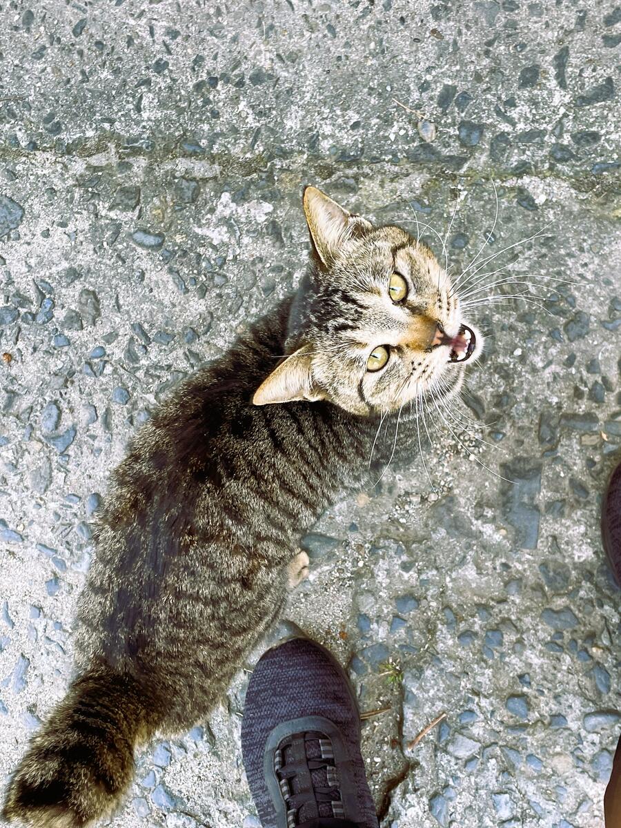 上陸すると早速、人懐っこい猫たちが出迎えてくれました。港のかわいい看板には「湯島はネコがいっぱい。でもノラ猫のいない島。島民みんなでネコにエサをやるオカシナ島です。」とあり、確かに痩せていかにも元気がないといった猫は見かけません(午後から出会う湯島小の3匹のネコちゃんは、丸々として大きかった!)。