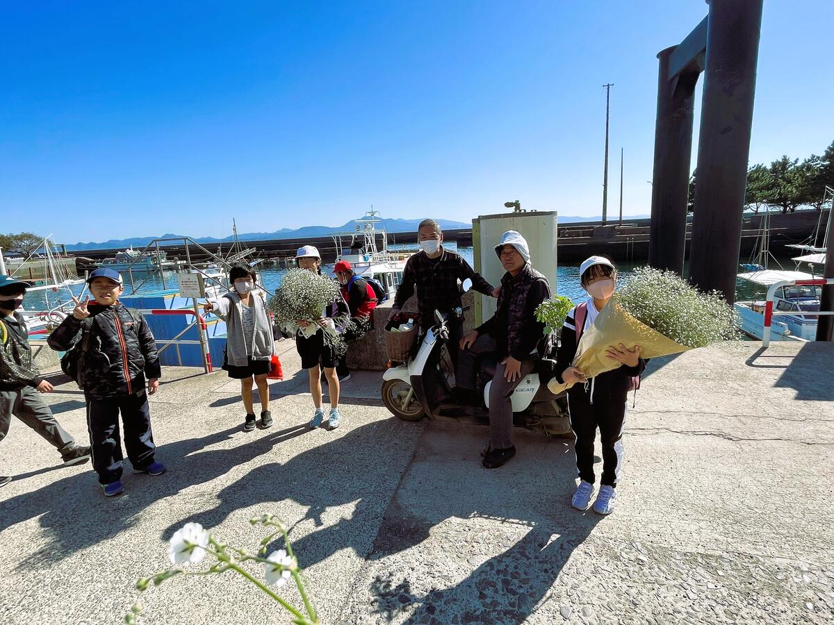 すると、船着き場に大きなかすみ草の花束。峯公園への途中で出会ったかすみ草農家の方からのお土産だとか。うわぁー。なんて素晴らしい方々。区長さんをはじめ、島の方々の包み込むような優しさと懐の深さに、ただただ感謝しました。