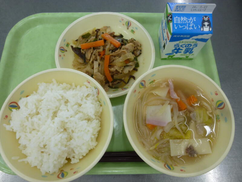 今日は具だくさんの焼肉炒めでした。給食で使うお肉は地元の「鹿釜精肉店」から納めてもらっています。熊本県産や上天草市産のお肉を、給食の献立に合わせて裁断してもらっています。子ども達に安心安全な給食を提供するための心強い味方です!
