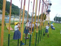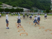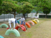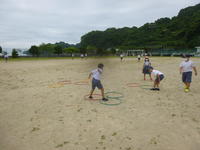 体育の授業は、マスクなしでもできますが、朝の運動や休み時間の遊びはマスク着用が原則です。できるだけ密を避けながら、いろいろな運動を体験できるように工夫しています。