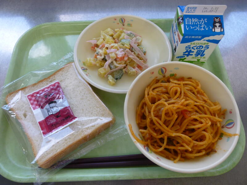 ☆食パン ☆牛乳 ☆スパゲティミートソース ☆さつまいもサラダ ☆マーシャルビーンズ