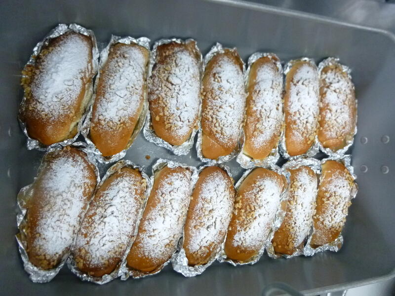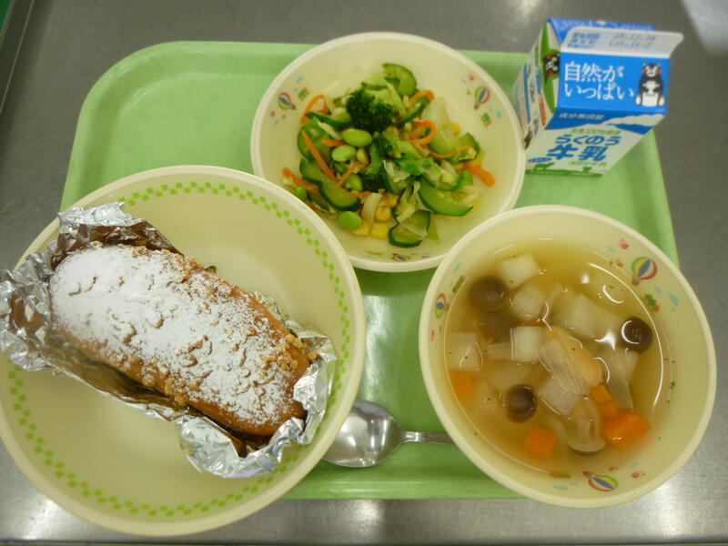 今日はシュトーレン風パンです。バターに黒糖やアーモンド・くるみなどを混ぜ合わせ、コッペパンにのせて焼きました。粗熱が取れたら、粉砂糖をふりかけました。給食室にいい香りが漂っていました。