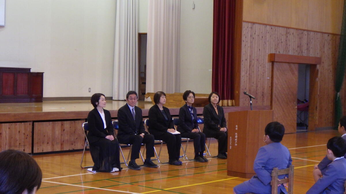 始業式に先立ち、異動に伴い4月から本校に赴任された5名の先生方をお迎えする就任式がありました。子供たちは興味津々といった感じで新しく来られた先生方の話を聞いていました。