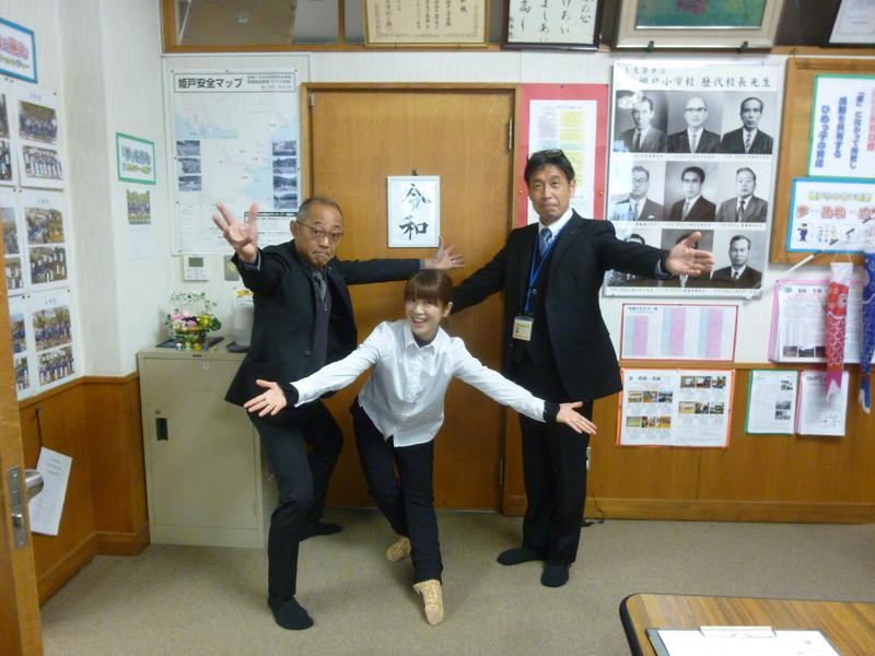 転回社の代表である小松野希海さんが来校され、校長室にていきいき芸術体験の見所等を紹介していただきました。実は、小松野さんは私と髙須賀教頭の友人の長女という縁もあり、以前から交流を希望していたのです。校長室では挨拶がわりに、こんな3ショットでお迎えしました。
