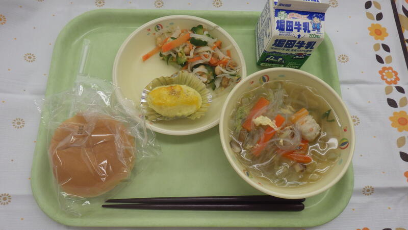 今日の献立:丸パン 牛乳 肉団子と白菜のスープ じゃこナッツサラダ スイートポテト