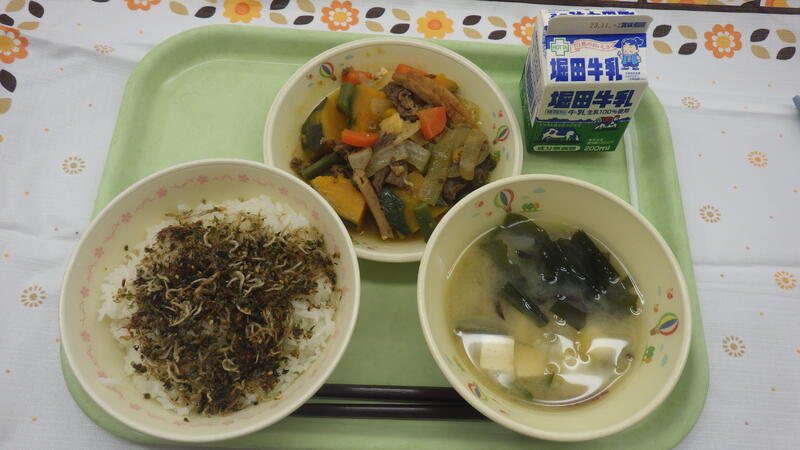 今日の献立:教良木ご飯 牛乳 きくらげの味噌汁 かぼちゃのふくめ煮 手作りふりかけ