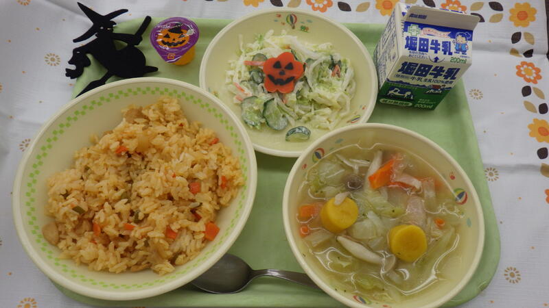 今日の献立:チキンライス 牛乳 かぼちゃのニョッキスープ おばけのサラダ ハロウィンゼリー