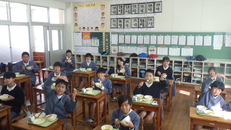 今日はいつもの教良木米ではなく、大矢野町中地区の満田農園で育てられた新米を使っています。給食時間の放送では、お米を育てる大変さについて農家さんの思いを紹介しました。上天草市の地場産物を食べて学ぶ機会となりました。