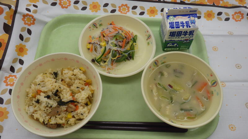 今日の献立:キムタクご飯 牛乳 秋野菜の味噌汁 春雨の酢の物