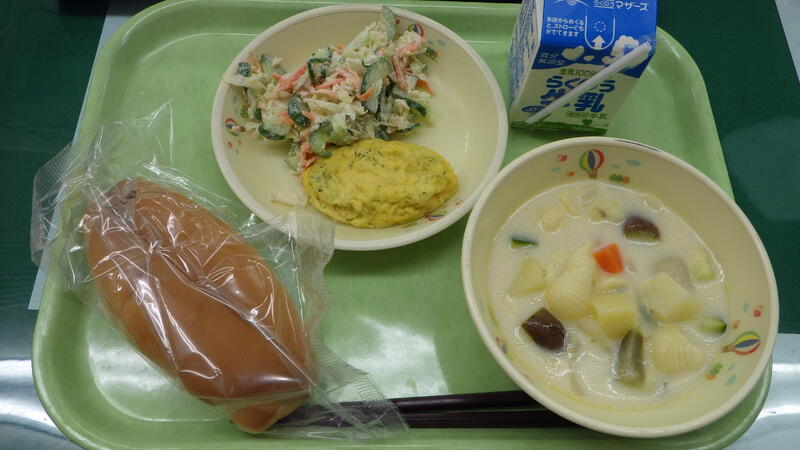 ☆コッペパン ☆牛乳 ☆夏のコロコロスープ ☆オムレツ ☆ツナサラダ