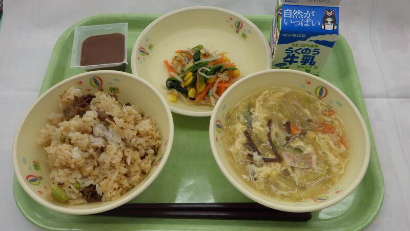 ☆ご飯 ☆牛乳 ☆茎わかめのカミカミキムチスープ ☆いわしのしょうが煮 ☆ほうれん草のあえもの