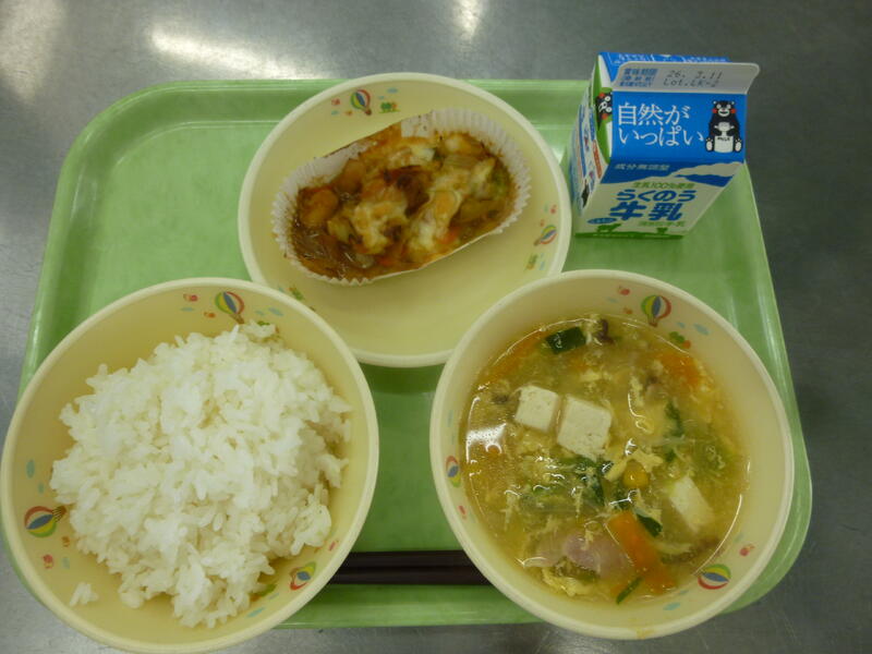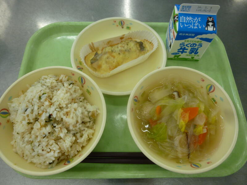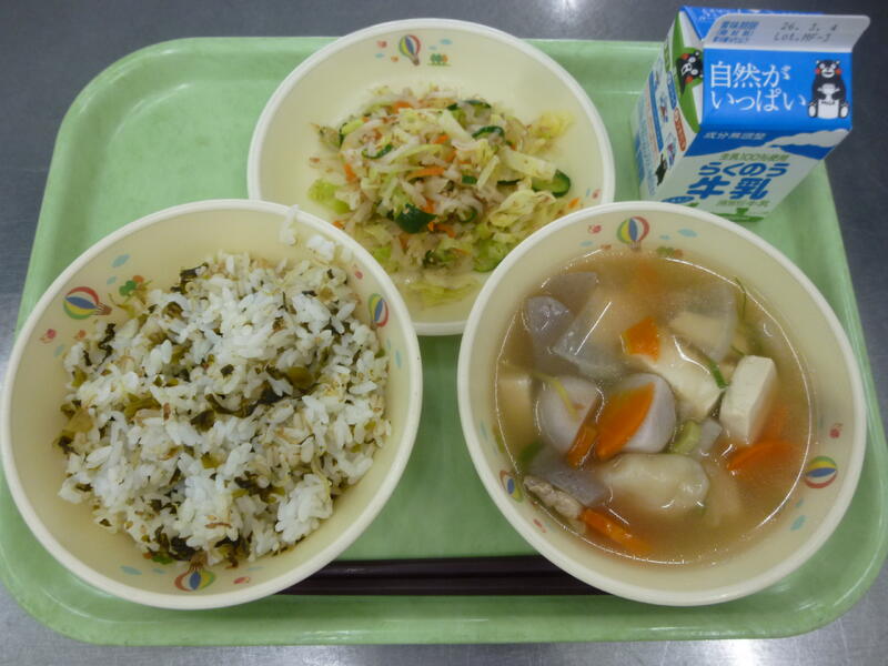 今月のふるさとくまさんデーは「阿蘇の味」です。阿蘇の特産品の一つ「高菜」を使った混ぜご飯です。農業の盛んな阿蘇地区は、阿蘇高菜以外にも野菜や漬物、乳酸品など様々な特産品や郷土料理がありますね。