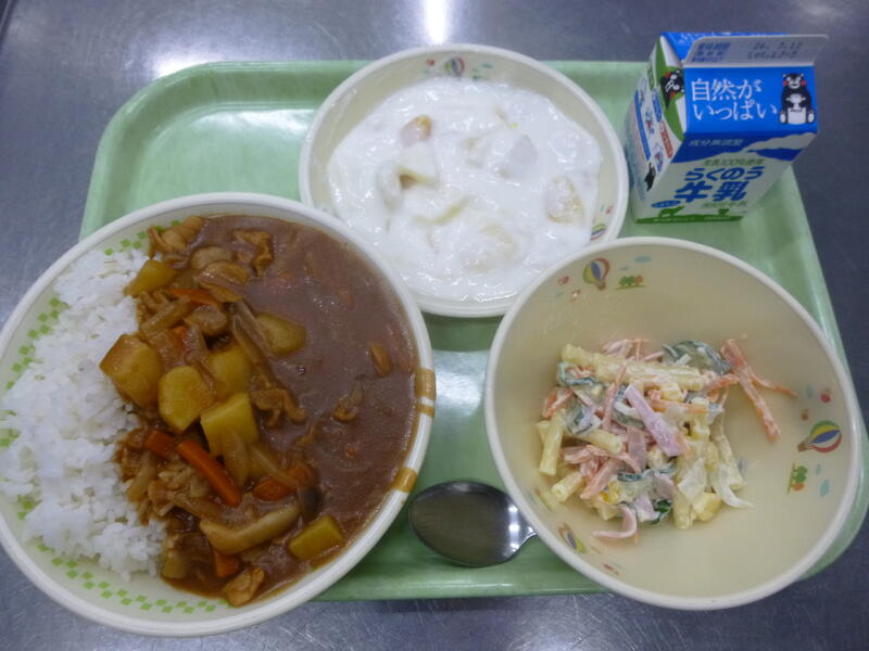 ☆梅肉ポークのハヤシライス ☆牛乳 ☆マカロニサラダ ☆フルーツヨーグルト