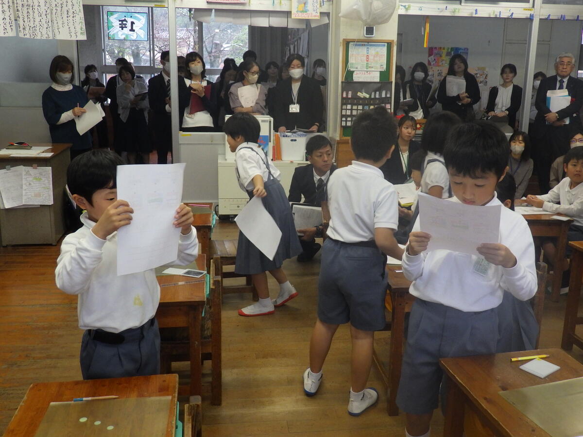 教室に入りきれず、廊下にあふれるほどたくさんの参観者に囲まれながらも、いつもどおり意欲的に学習に取り組む姿を見せてくれました。さすがは1年生!