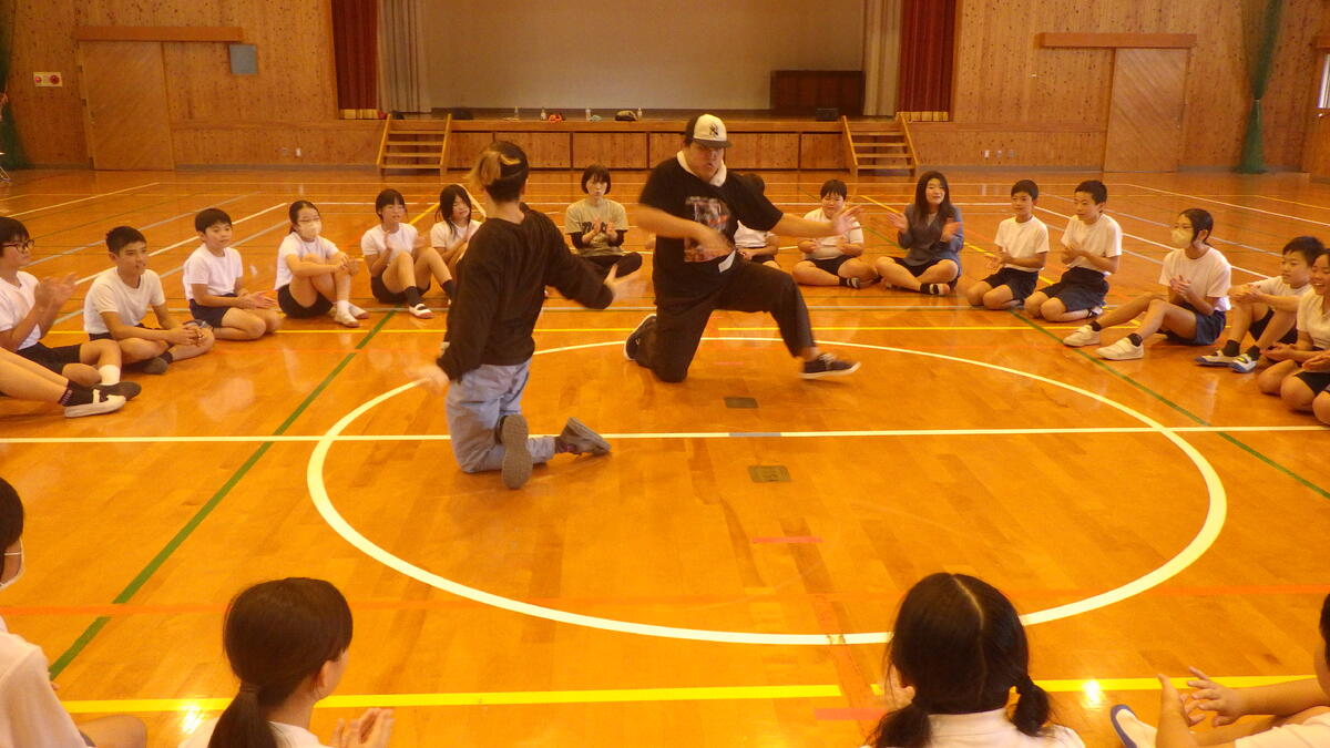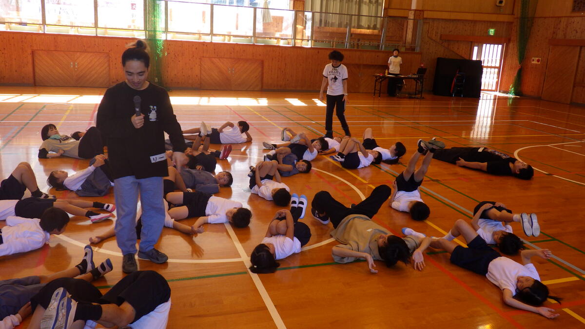 「床に背中をつけて!」ダンスにつながる動きを体験しています。