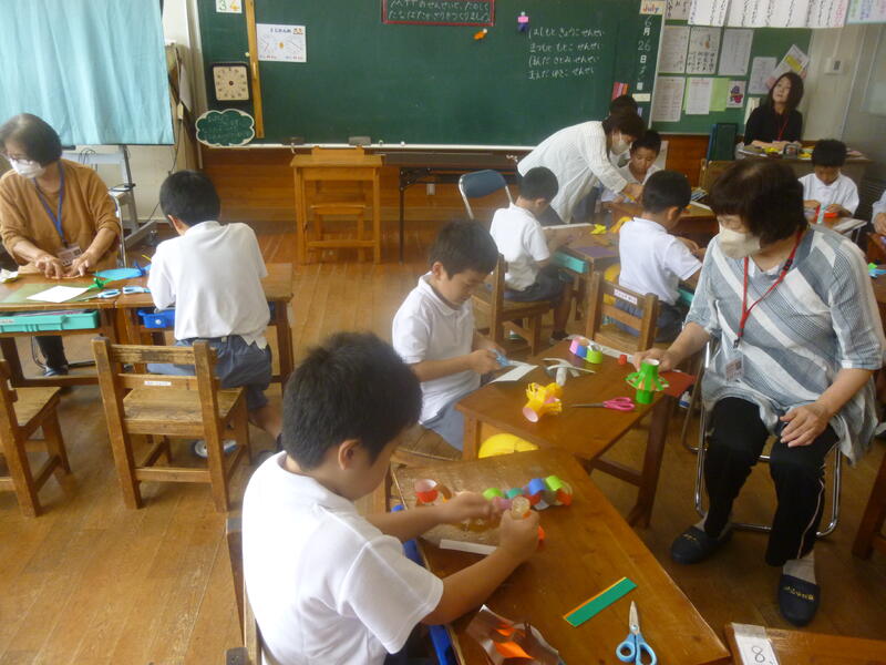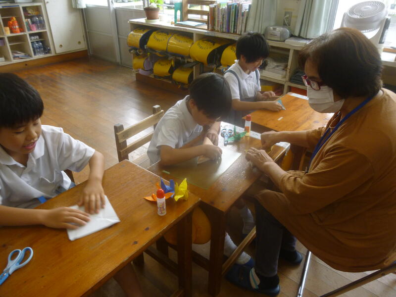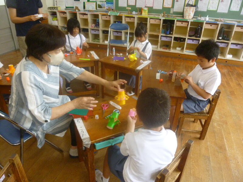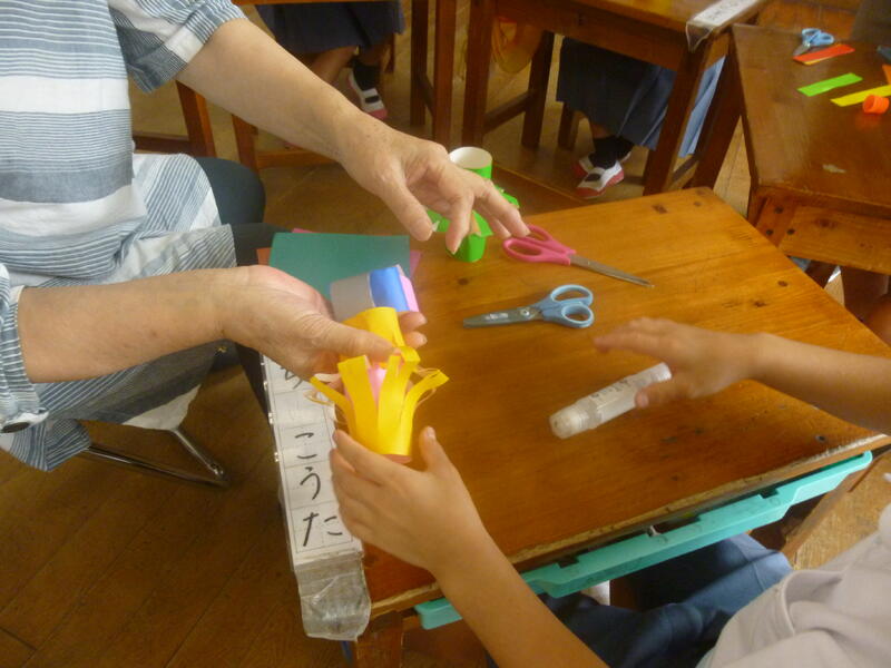 1・2年生が2・3時間目に七夕飾り作りに取り組みました。4名のMTT(マイタウンティーチャー)から作り方を教えていただきながら、みんな夢中になって楽しく作っていました。