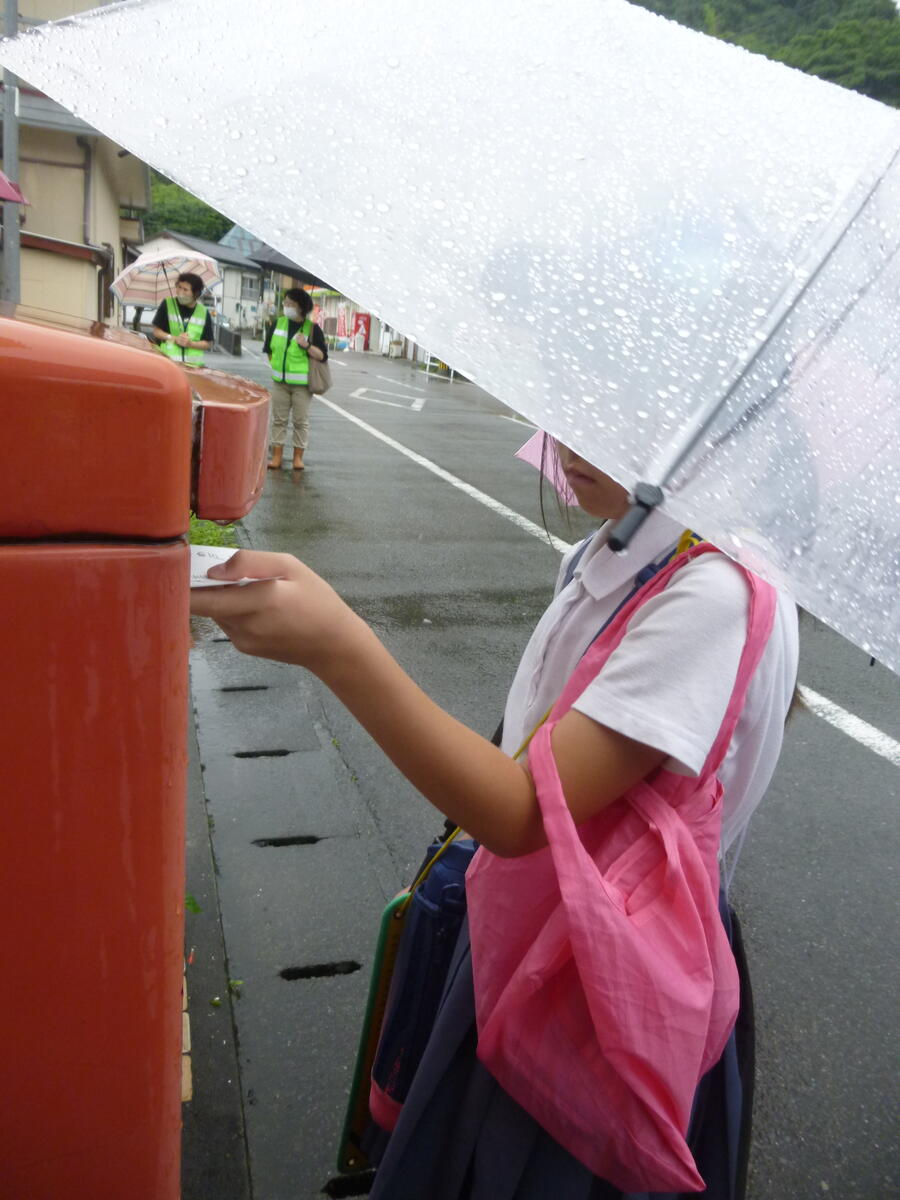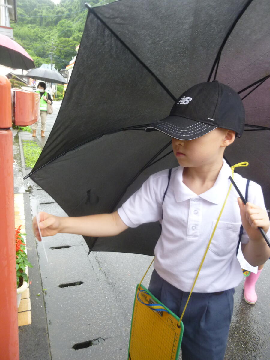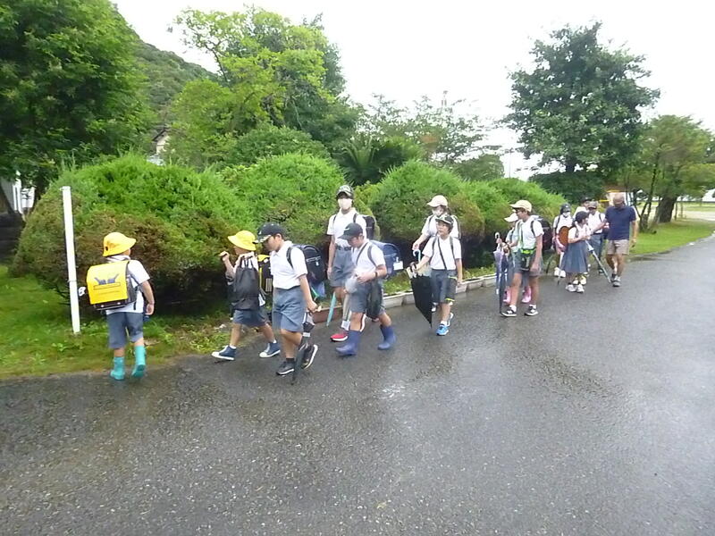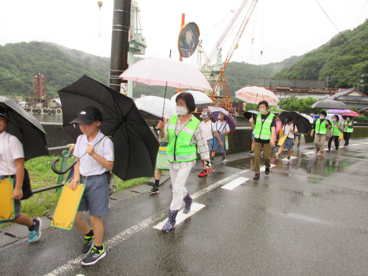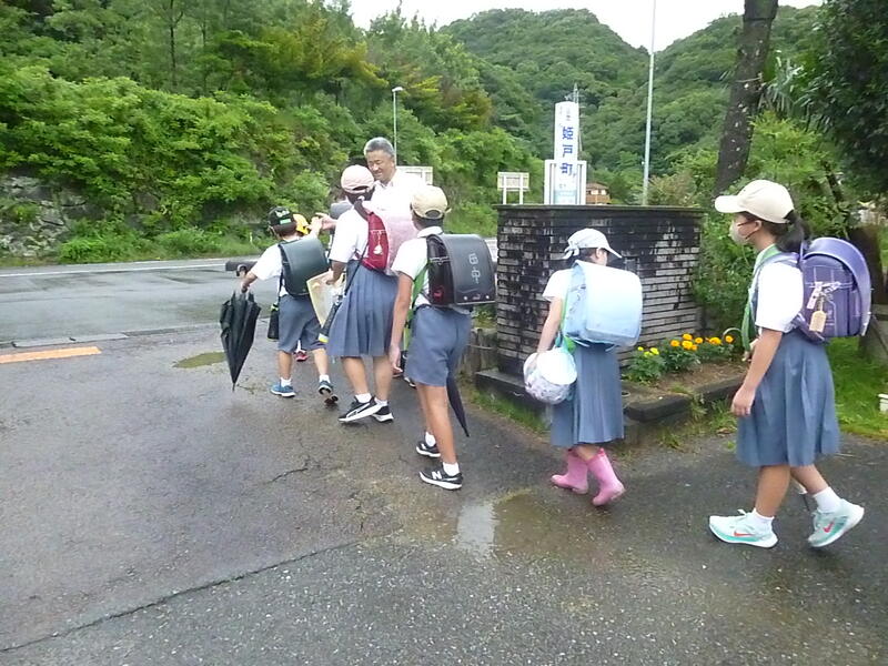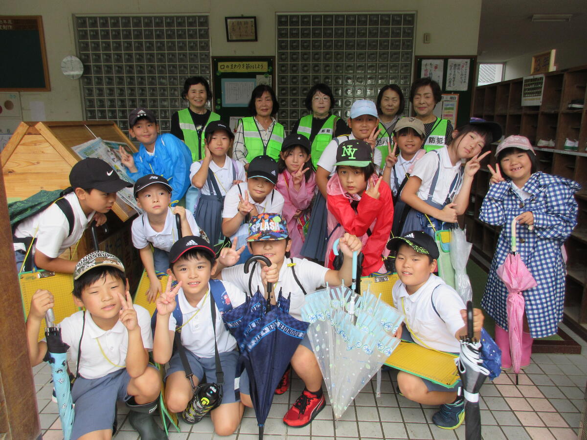 雨の中、地域ボランティアの方々に子供たちの見守りをしていただきました