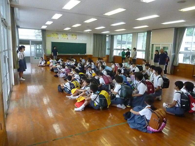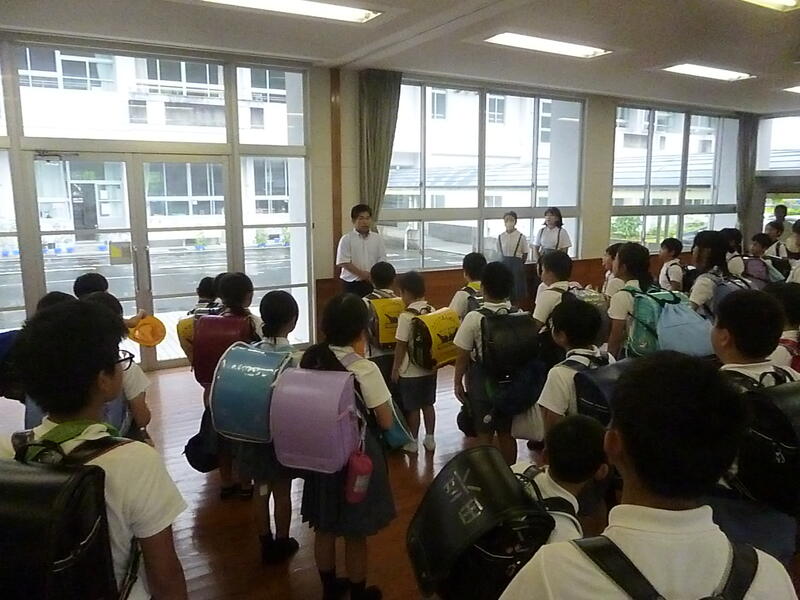 今日は午後から職員研修のため、4時間授業、給食後に下校となりました。今日のように一斉下校をする場合、子供たちはいったん全員集まり、運営委員の司会で連絡等を聞いた後、下校となります。今日は雨天のため、いつもの児童玄関前ではなく多目的ホールで行いました。