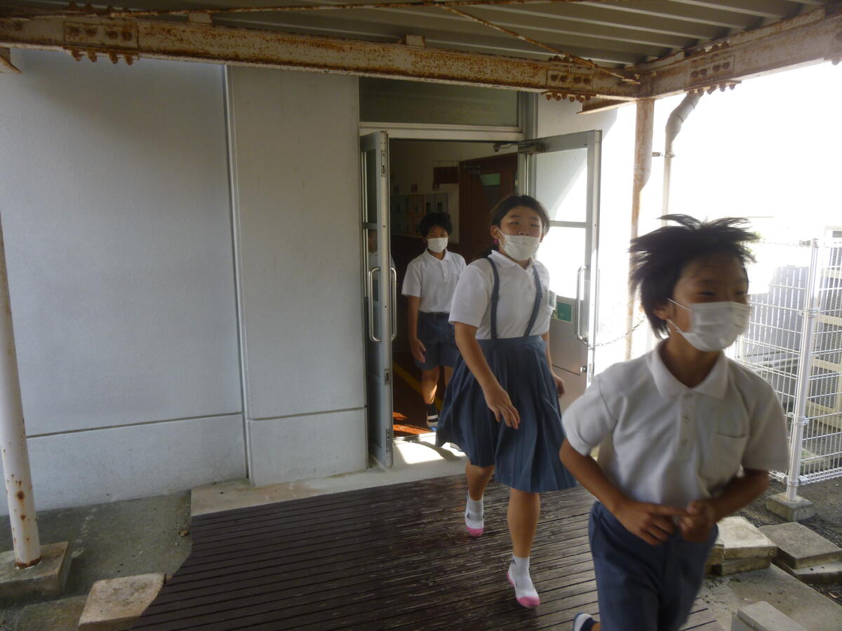 この後、体育館において、駐在所の方からの講評と校長の話がありました。共通点は、「先生の話(指示)をしっかり聞いて、命を守る行動をとることが大事!」ということでした。