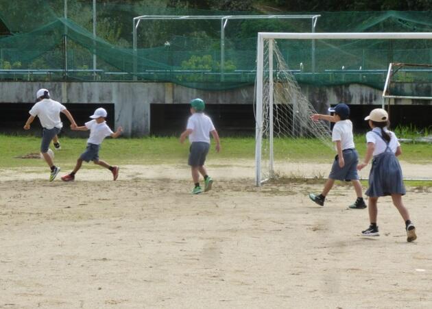 運動場では、2年生がサッカーをしていました。サッカーゴールのネットは張り替えが必要ですね・・・