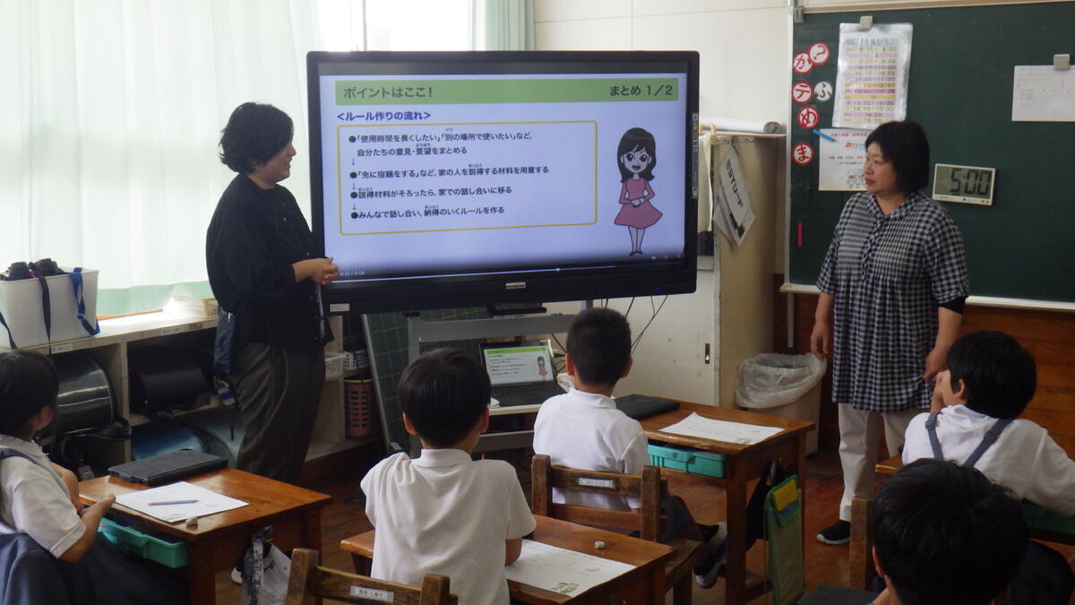 時間目、2・3年教室では、担任とICT支援員の先生によるゲームの使い方についての学習があっていました。