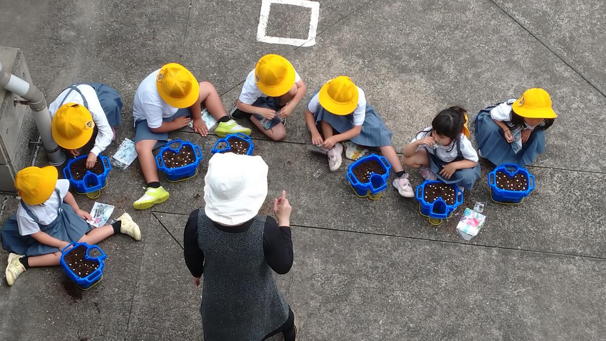 1年生はアサガオの種をそれぞれ鉢に植えていました。