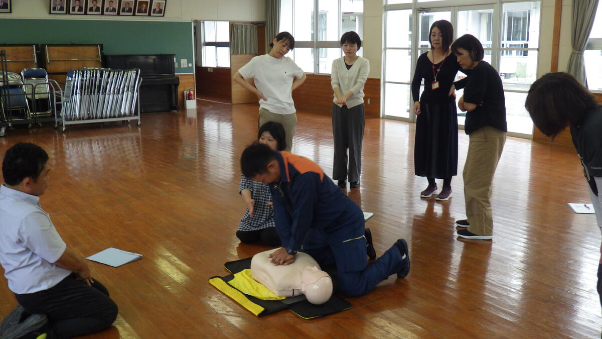 今日、子供たちが下校した後に、職員の研修がありました。内容は「救命救急法講習会」でした。