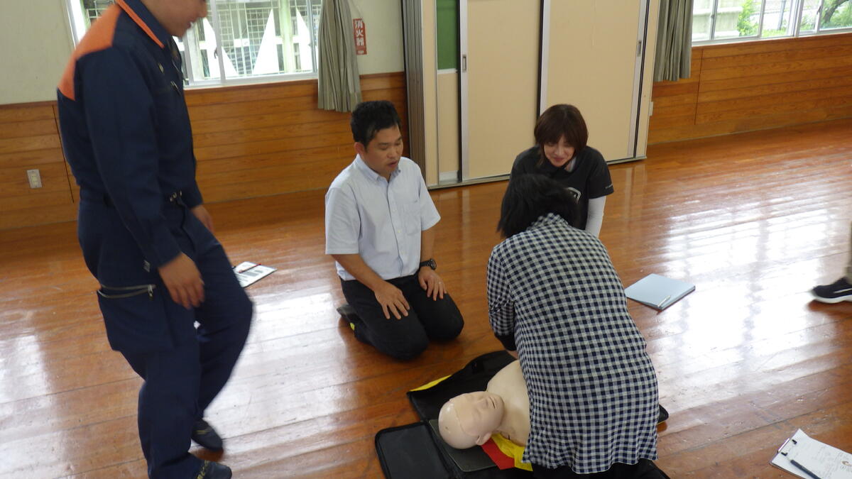 消防署から講師としておいでいただき、胸部圧迫、人工呼吸、AEDの使用法、異物除去、エピペンの使用法等について詳しく教えていただきました。