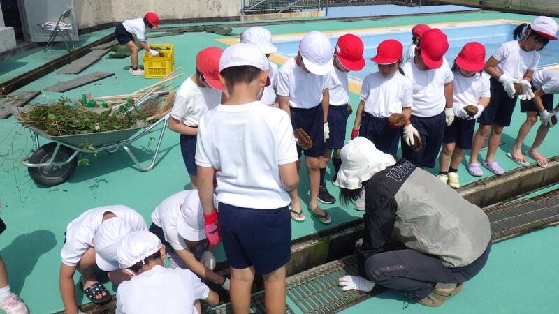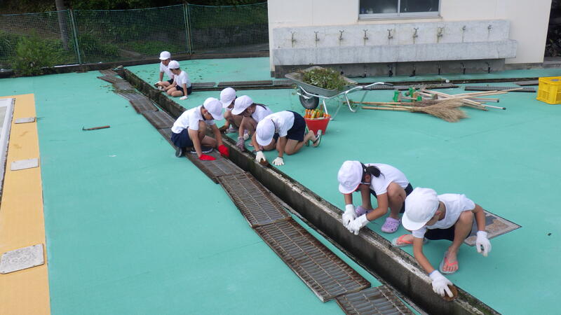 2時間目は、1、2年生で小プールサイド周辺の排水溝の掃除を行いました。プールサイトの草取りやたわしで排水溝のコケを落とし、スコップで一輪車に入れる作業でした。少ない人数でよく頑張りました。