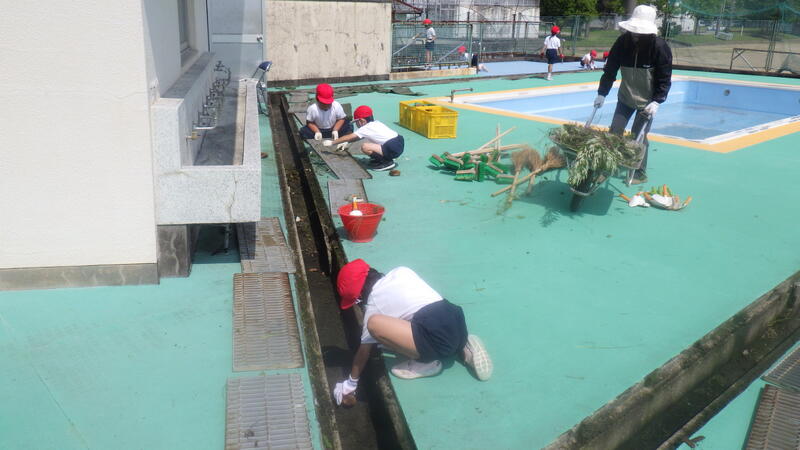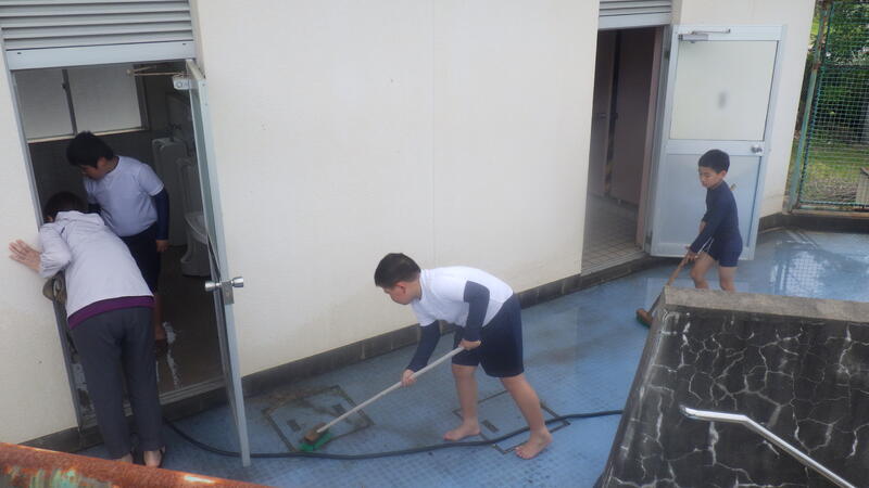 5校時は、3~6年生で小プールのしあげ、トイレや更衣室、そして大プールの掃除を行いました。それぞれが決められた場所を、たわしやデッキブラシを手にして、頑張ってきれいにしました。