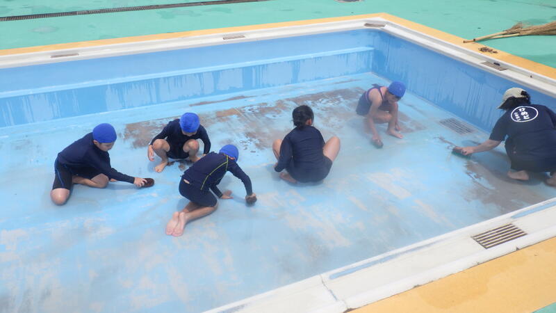 まだまだ、肌寒さを感じる中、本日、プール掃除を行いました。