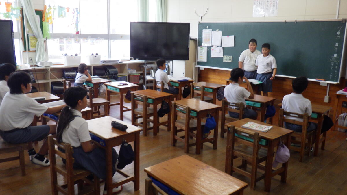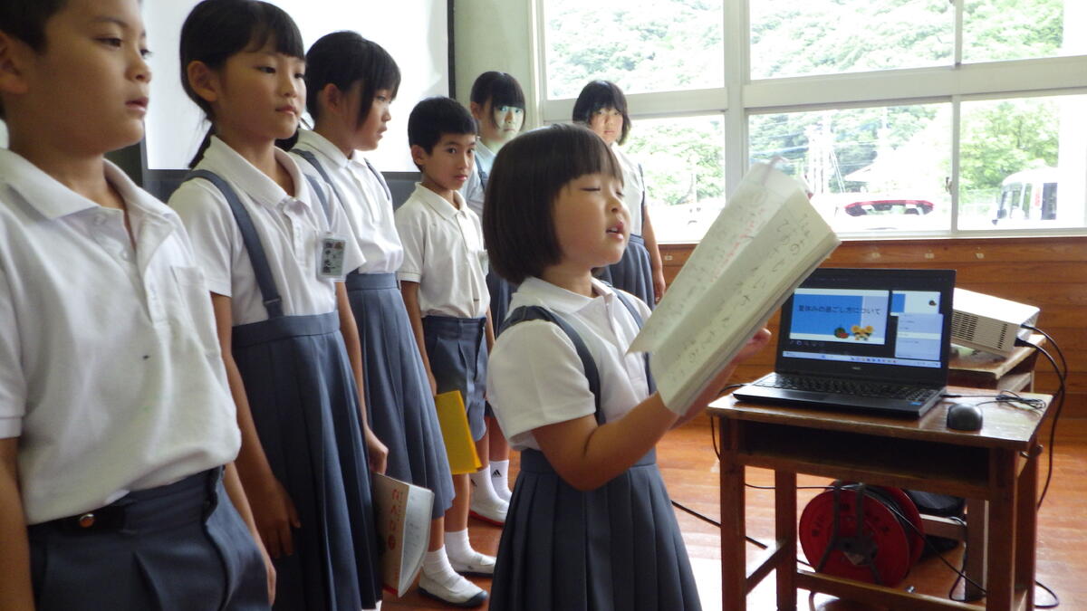 終業式では、 まずはじめに、各学年代表児童による発表がありました。どの児童もしっかりと1学期を振り返り、夏休み、そして2学期に頑張ることを発表することができていました。