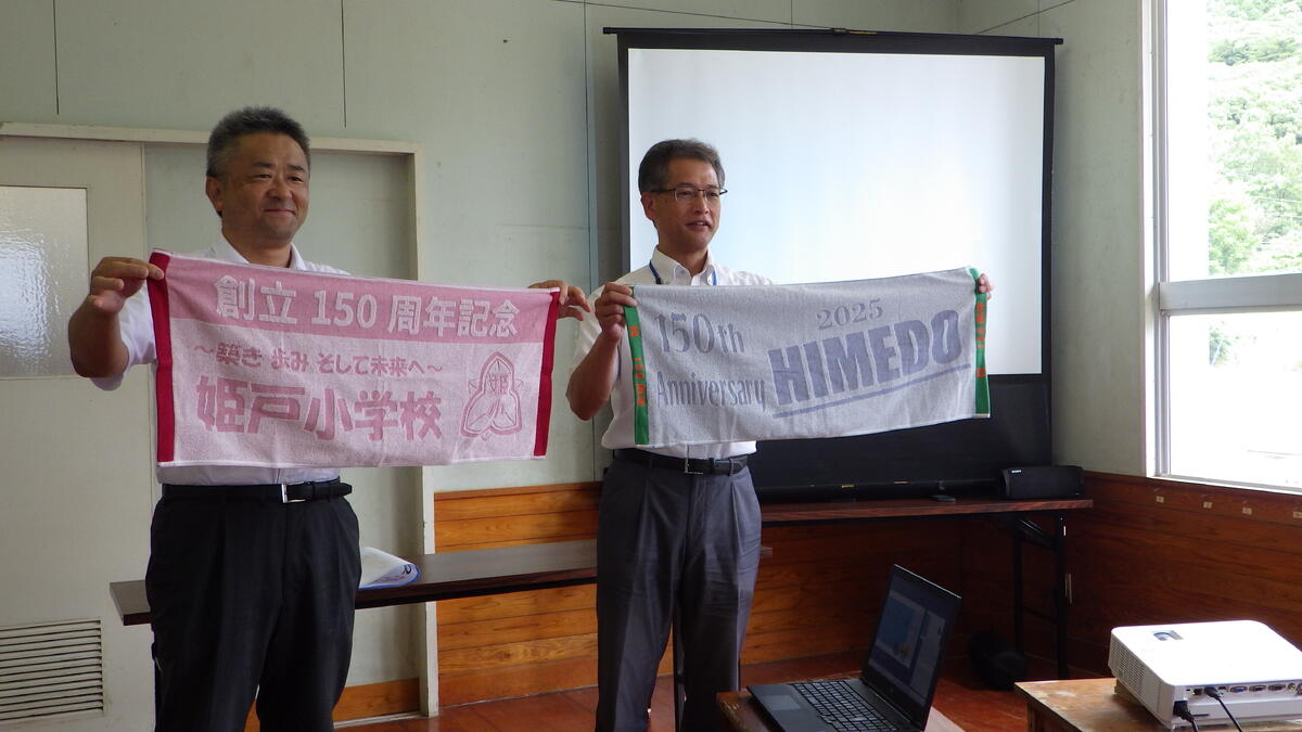 これは、創立150周年記念のタオルです。8月15日(金)の姫戸の夏祭りの際、会場で販売する予定です。ちなみに、子供たちには好評価でした。保護者の皆様、地域の皆様、夏祭り当日、ぜひお買い求めください。ご協力のほど、よろしくお願いします。