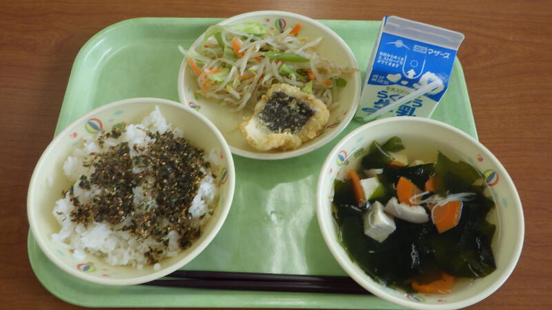 ☆教良木ごはん ☆牛乳 ☆豆腐のすまし汁 ☆ハモのからあげ ☆いんげんのごまあえ ☆手作りふりかけ