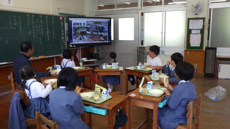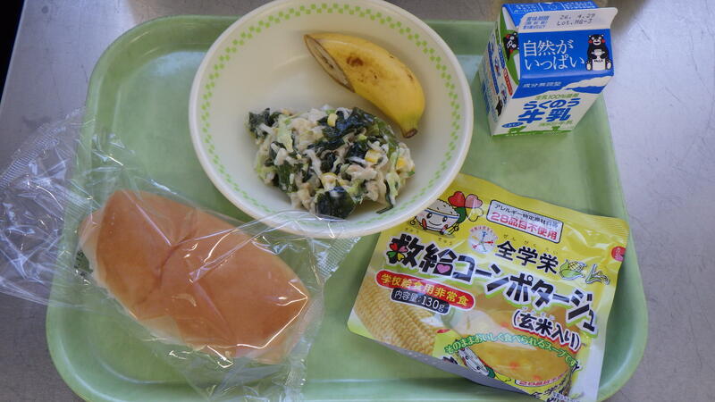熊本地震から10年の今日は「防災給食」です。学校給食用の非常食である「救給コーンポタージュ」と、切り干し大根や乾燥わかめ、漬物など長期保存できる食材を使ったサラダなど、災害時を考えた献立になっています。給食時間には防災給食についての動画を視聴しました。