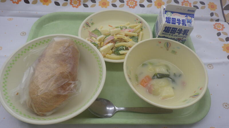 今日の献立:きなこ揚げパン 牛乳 クラムチャウダー マカロニサラダ