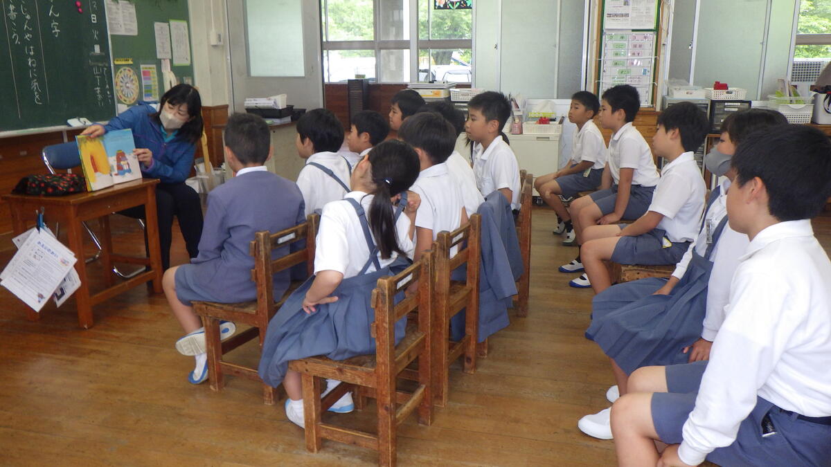 まず、朝の活動の時間には、2学期最後の読み聞かせがあり、4名の方にそれぞれの学年に応じた絵本の読み聞かせをしていただきました。