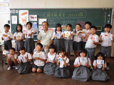 一覧へ 絵手紙教室 投稿日時: 09/19 学校サイト管理者 18日(木)、今年も、日奈久在住の佐藤士郎先生をお招きし、 1,2年生絵手紙教室を開催しました。 佐藤先生のアドバイスにより、子供たちは「ありがとう」の気持ちを、 日奈久の特産物やいいところを紹介する絵手紙に込めて、完成させました。 佐藤先生、今年もありがとうございました。