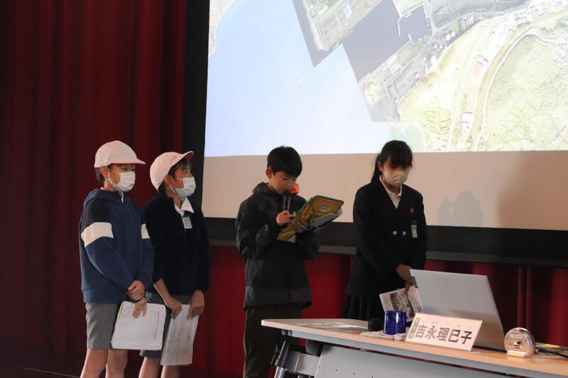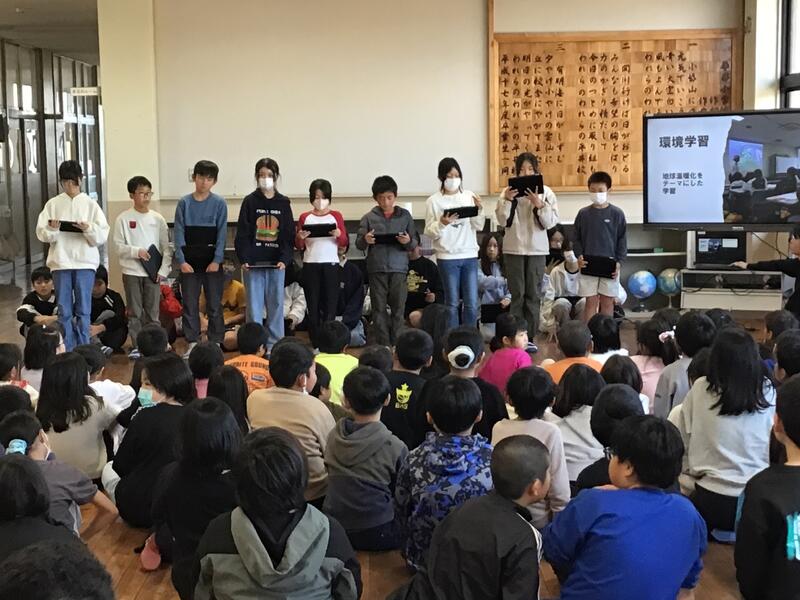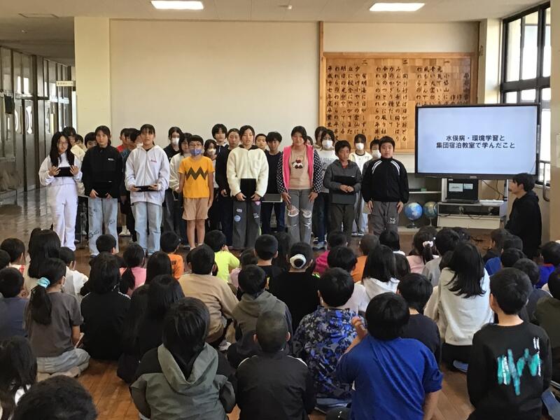 今日の児童集会は、5年生の発表でした。5年生は、11月19日(水)・20日(木)に行った水俣での学習、あしきた青少年の家での集団宿泊教室について発表しました。