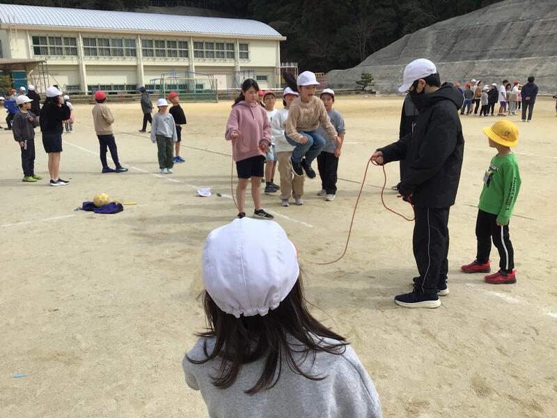 8の字跳びは、縄を回すタイミングと走り抜けるリズムがそろわないとうまく続きません。高学年の子どもが低学年の子どもの手を取りながら動き方を教えたり、「次いくよ」「うまい!」と声をかけ合ったりする姿があちこちで見られ、さっそく班のチームワークが素晴らしいなと感じました。