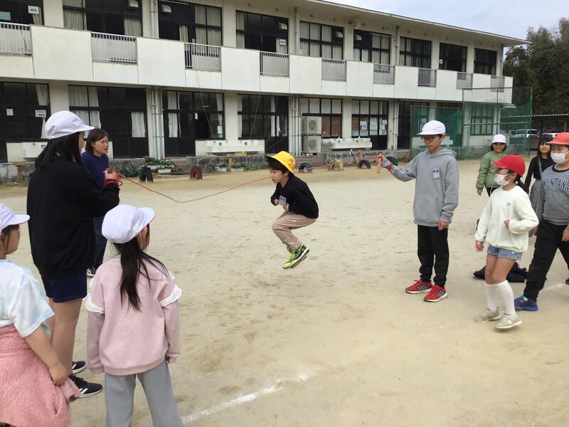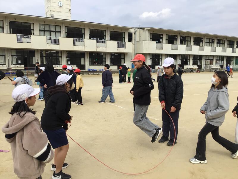 業間休みに縦割り班で挑戦! 8の字跳びで心をひとつに!!
