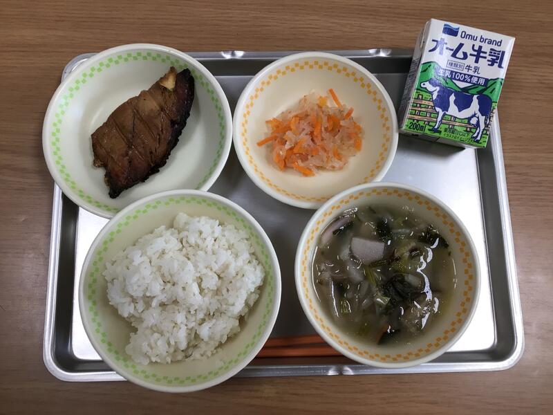 2026年最初の給食は、麦ごはん、牛乳、雑煮、ぶりの照り焼き、紅白なますでした。