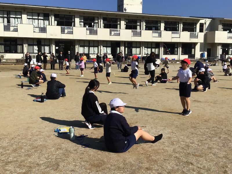 8の字跳びは、縄を回すタイミングと走り抜けるリズムがそろわないとうまく続きません。高学年の子どもが低学年の子どもの手を取りながら動き方を教えたり、「次いくよ」「うまい!」と声をかけ合ったりする姿があちこちで見られ、さっそく班のチームワークが素晴らしいなと感じました。