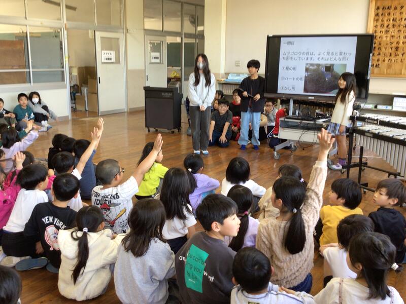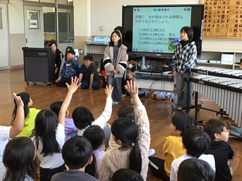 本日の児童集会では、4年生による発表が行われました。荒尾干潟や通潤橋に関するクイズを出題し、他の学年の子どもたちも大いに盛り上がりました。さらに、発表の後半では、鍵盤ハーモニカ、リコーダー、鉄琴、小太鼓など、さまざまな楽器を使って「鉄腕アトム」の合奏を披露しました。何度も練習を重ねてきた成果があらわれた、息の合った演奏に、会場は大きな拍手に包まれました。