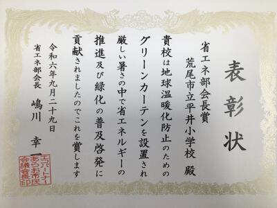 近い将来と遠い未来の地球環境について子どもたちが共に考えを深め合い、今の自分たちにできることに取り組んでいくプロジェクトのひとつである『グリーンカーテン』への平井小学校の取組が『省エネ部会長賞』に選ばれました。29日(日)に荒尾市中央公民館で行われた『令和6年度グリーンカーテン表彰式』で表彰していただきましたので報告します!