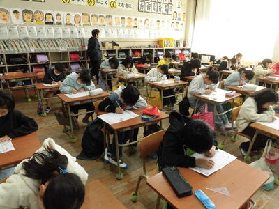 学校では、1年間のまとめの漢字大会や計算大会に取り組んでいます。